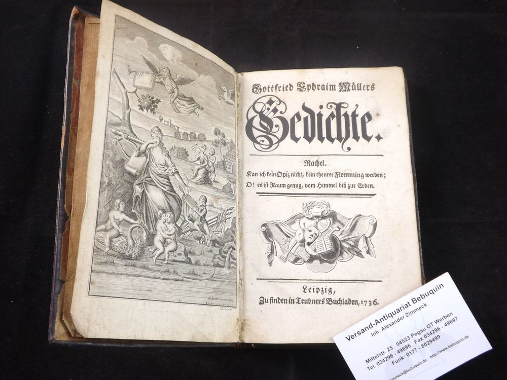 MÜLLER, Gottfried Ephraim: Gedichte. Leipzig (Teubner), 1736. 264 S. mit gestochenem Frontispiz, gest. Titelvignette und 3 Kopfvignetten. Ldr. der Zeit auf 7 Bünden mit goldgeprägtem Rücken. Deckel etwas verzogen und berieben, innen nur wenig braunfleckig. seltene EA des einzigen bei Goedeke IV,1,116,1 verzeichneten literarischen Werks des Pfarrers aus Pirna.