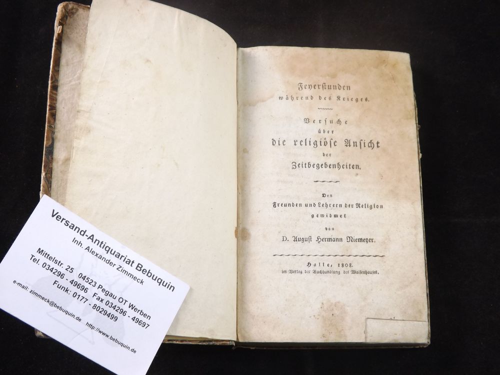NIEMEYER, August Hermann: Feyerstunden während des Krieges. Versuche über die religiöse Ansicht der Zeitbegebenheiten. Halle (Waisenhaus), 1808. kl. 8°. 1 Bl., IV, 328 S. Pb. der Zeit. Titel und erstes Blatt mit Eckabriss ohne Textverlust, anfangs stärker braunfleckig. EA des Erstlings des evangelischen Theologen und Pädagogen nach seiner Rückkehr von der Deportation als Geisel Napoleons. Goedeke VIII, 263, 33.