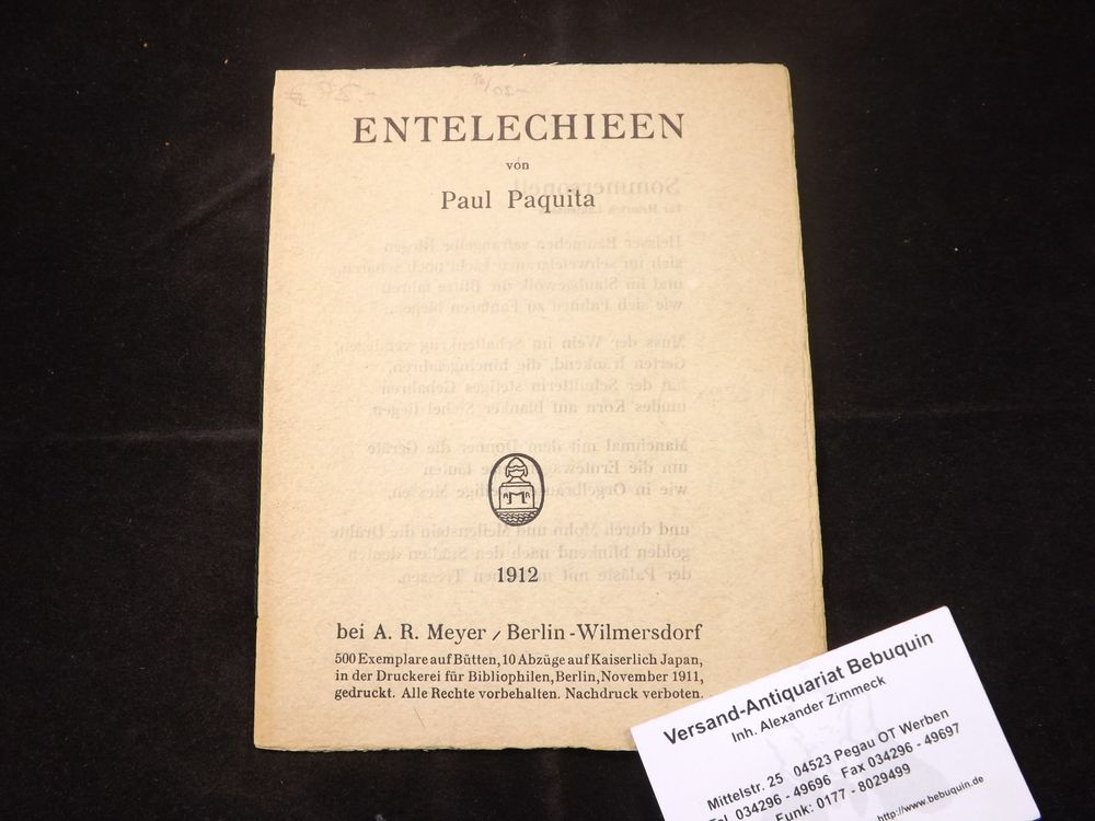 PAQUITA, Paul: (d. i. A. Ewald) Entelechieen. Berlin (A. R. Meyer), 1911. 4 Bl. OBr. feines Ex. 1 von 500 Ex. der ersten und einzigen Auflage Raabe 226.1.