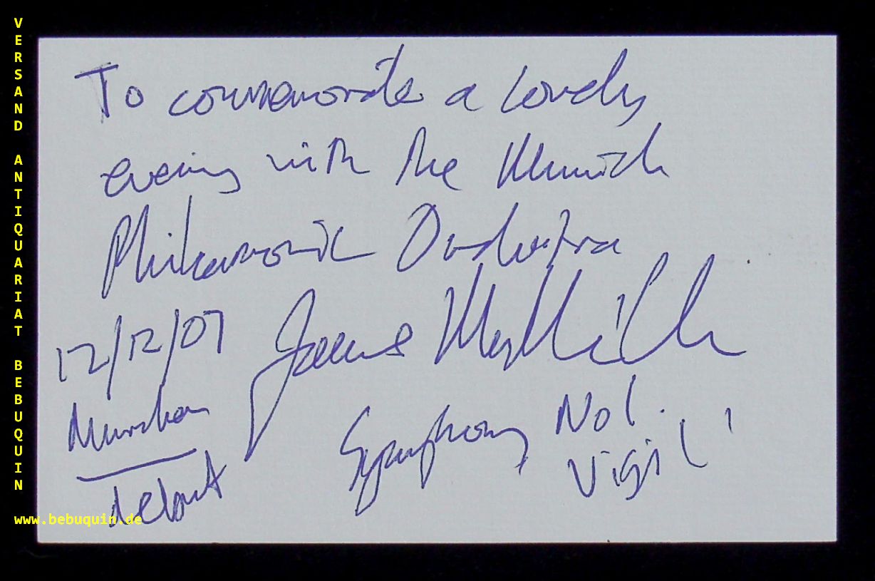 MACMILLAN, James (Komponist): eigenhändig signierte und datierte Autogrammkarte: . . . a lovely evening with the Munich Philharmonic Orchestra. München Debut. München (Philharmonie), 12.12.2007.. 8 x 12,5 cm. Karteikarte. Sir James Loy MacMillan (* 16. Juli 1959 in Kilwinning, North Ayrshire) ist ein schottischer Komponist und Dirigent klassischer Musik. (Wikipedia)