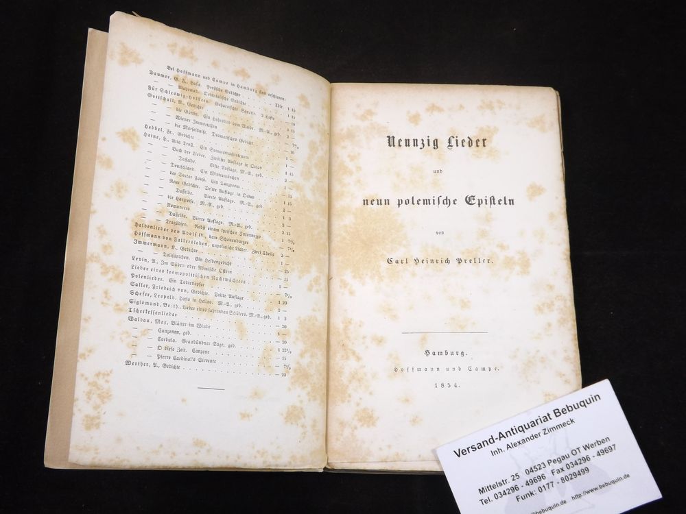 PRELLER, Carl Heinrich: Neunzig Lieder und neun polemische Episteln. Hamburg (Hoffmann und Campe), 1854. kl. 8°. 112 S. neue Br. mit aufgezogenem OUmschl. stockfleckig, unaufgeschnitten. seltene EA des Erstlingswerks Kosch III, 2106; Brümmer V S. 339.