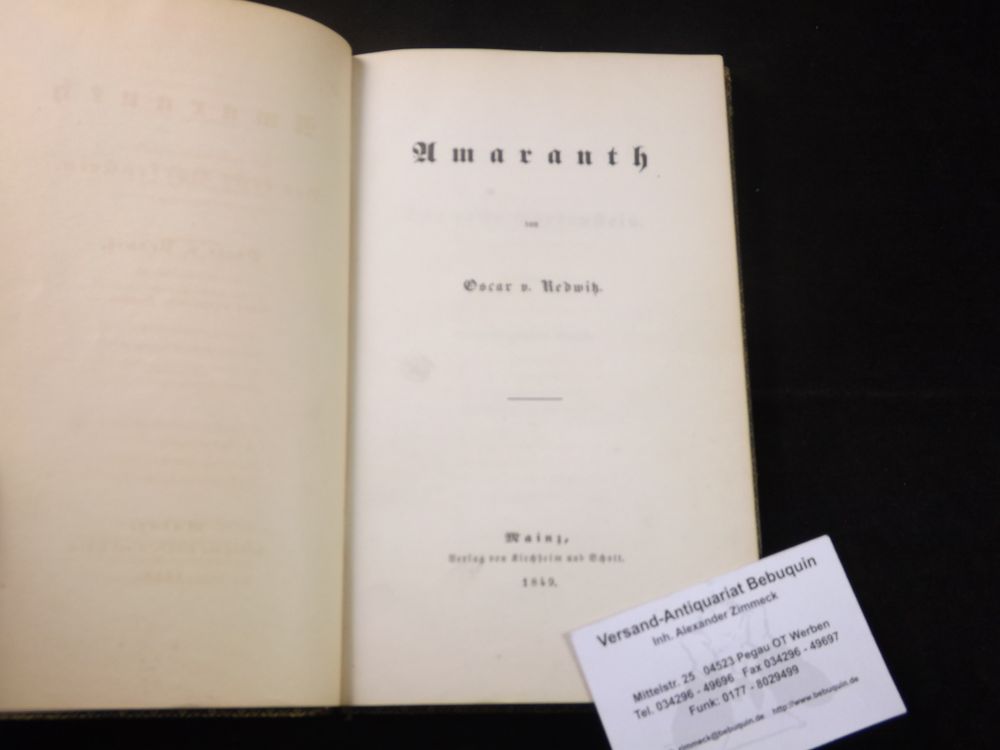 REDWITZ, Oscar von: Amaranth. Mainz (Kirchheim und Schott), 1849. XVI, 300 S. OLdr. mit biedermeierlicher Blind- und Goldprägung. Rücken angeplatzt, alte Eintragung auf Vorsatz, Redwitz´ Lebenslauf bis 1851 betreffend. EA des Erstlings WG² 1.