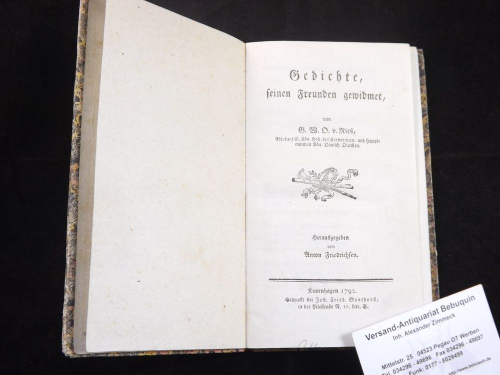RIES, Georg Wilhelm Otto von: Gedichte, seinen Freunden gewidmet. Hrsg. von Anton Friedrichsen. Kopenhagen (Morthorst), 1792. 84, 48 S. Pb. der Zeit mit goldgeprägtem Rücken. Titelblatt des Anhangs fehlt möglicherweise. EA. Goedeke VIII, 512, 4, 1. — Seltenes Erstlingswerk des schriftstellernden Offiziers mit einem Anhang der vom Verfasser nicht für den Druck bestimmten Gedichte. – Georg Wilhelm Otto von Ries (Hanau 1763 – 1846 Kopenhagen) war Kapitän und Adjutant beim dänischen Kronprinzen, Generaladjutant und Kammerherr beim dänischen König.