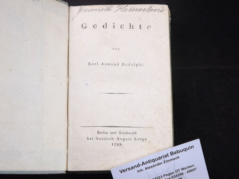 RUDOLPHI, Karl Asmund: Gedichte. Berlin (Lange), 1798. kl. 8°. 8 Bl., 174 (2) S. Pb. der Zeit mit goldgeprägtem Rückenschild. NaT. sehr seltene EA des literarischen Erstlingswerks des deutschen Mediziners, Naturforschers, Botanikers und Zoologen. Schon in Greifswald lieferte er die wichtigen, seinen Ruf besonders begründenden Arbeiten über Eingeweidewürmer und Anatomie der Pflanzen.