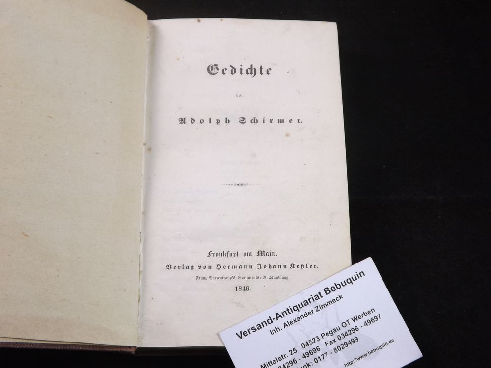 SCHIRMER, Adolph: Gedichte. Frankfurt (Keßler), 1846. XII, 384 S. Ln. der Zeit mit goldgeprägtem Rücken. gutes Ex. EA des Erstlingswerks Kosch XV, 44.