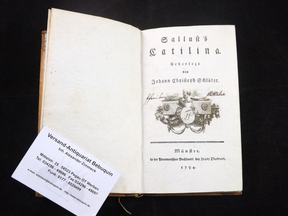 SCHLÜTER, Johann Christoph: (Übers.) Sallust’s Catilina. Münster (Platvoet), 1794. kl. 8°. XXVI, 102 S. mit gestochener Titelvignette. HLdr. der Zeit mit goldgeprägtem Rücken. NaT, gutes Ex. EA des Erstlingswerks Ebert 20095. Schlüter wurde 1804 Professor der römischen Literatur an der Universität Münster.