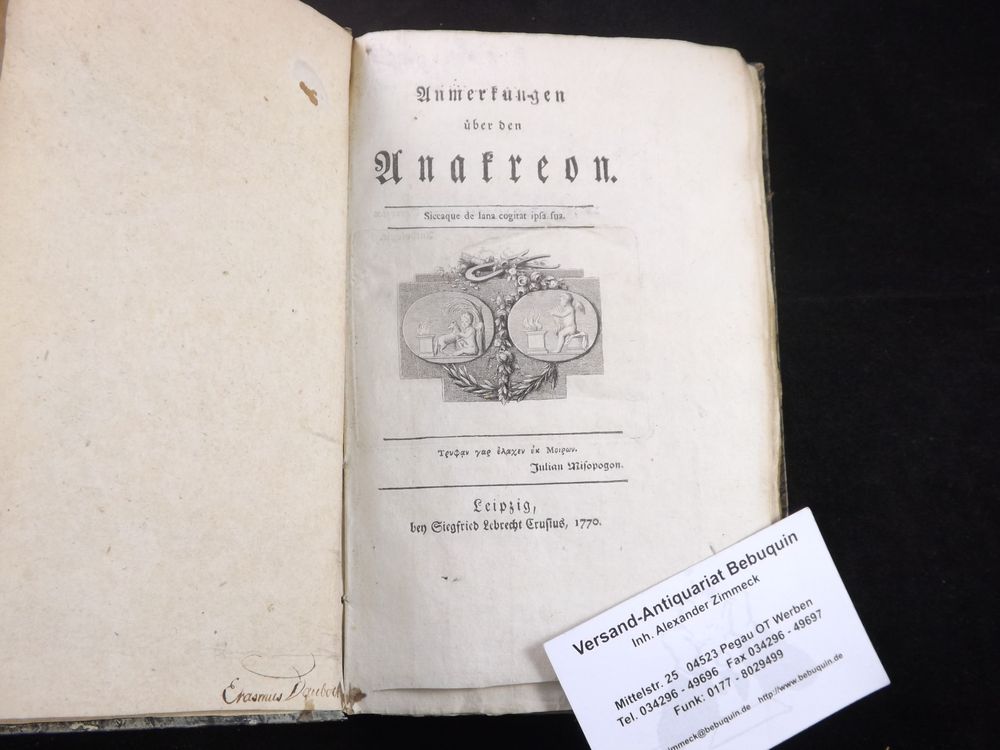 (SCHNEIDER, Johann G.:) Anmerkungen über den Anakreon. Leipzig (Crusius), 1770. 3 Bl., LXIV, 364 S. mit gestochener Titelvignette. Pb. der Zeit. unbeschnitten, Vorsatz mit Bleistiftmarginalien. seltene EA der ersten Veröffentlichung des Altphilologen, Naturwissenschaftlers und späteren Direktors der Breslauer Universitätsbibliothek.