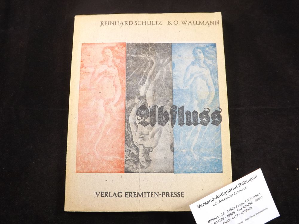 SCHULTZ, Reinhard: Abfluss. Hrsg. V. O. Stomps. Stierstadt (Eremiten Presse), 1966. 26 S. + 10 Maschinenemalereien von Bernd O. Wallmann als Blockbuch gebunden. farb. ill. OBr. kaum bestoßen. Nr. 186 bzw. Nr. 17 von 222 Ex. mit der eigenhändigen Verfasserunterschrift am Druckvermerk.
