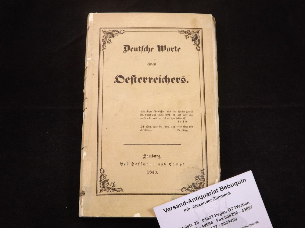 (SCHUSELKA, Franz:) Deutsche Worte eines Oesterreichers. Hamburg (Hoffmann und Campe), 1843. kl. 8°. 4 Bl., 212 S. Kart mit aufgesetzter OBr. unbeschnitten. EA des Erstlingswerks des liberalen, österreichischen Politikers. Holzmann / Bohatta 4, 12956.