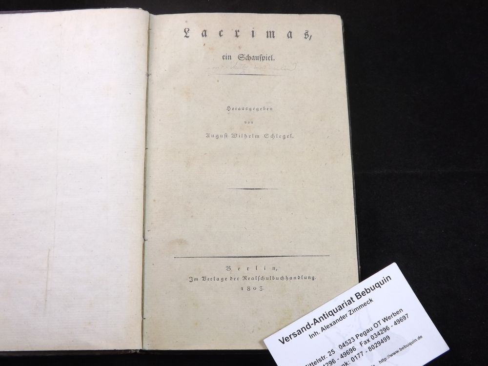 SCHÜTZ, Wilhelm von: Lacrimas, ein Schauspiel. Hrsg. Von August Wilhelm Schlegel. Berlin (Realschulbuchhandlung), 1803. 1 Bl., 140 S. Pb. der Zeit. Rückenschild gebräunt, NaV. EA des Erstllingswerks mit einem Sonett von A.W. Schlegel im Erstdruck. WG² 14.