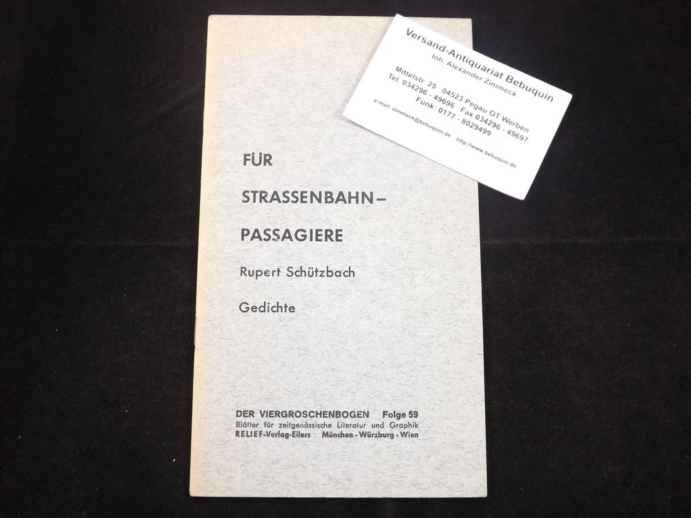 SCHÜTZBACH, Rupert: Für Straßenbahn-Passagiere. Gedichte. München (Relief), 1965. 12 S. OKart. = Viergroschenbogen Folge 59. EA des Erstlings mit eigenhändiger, datierter Widmung auf Vorsatz.