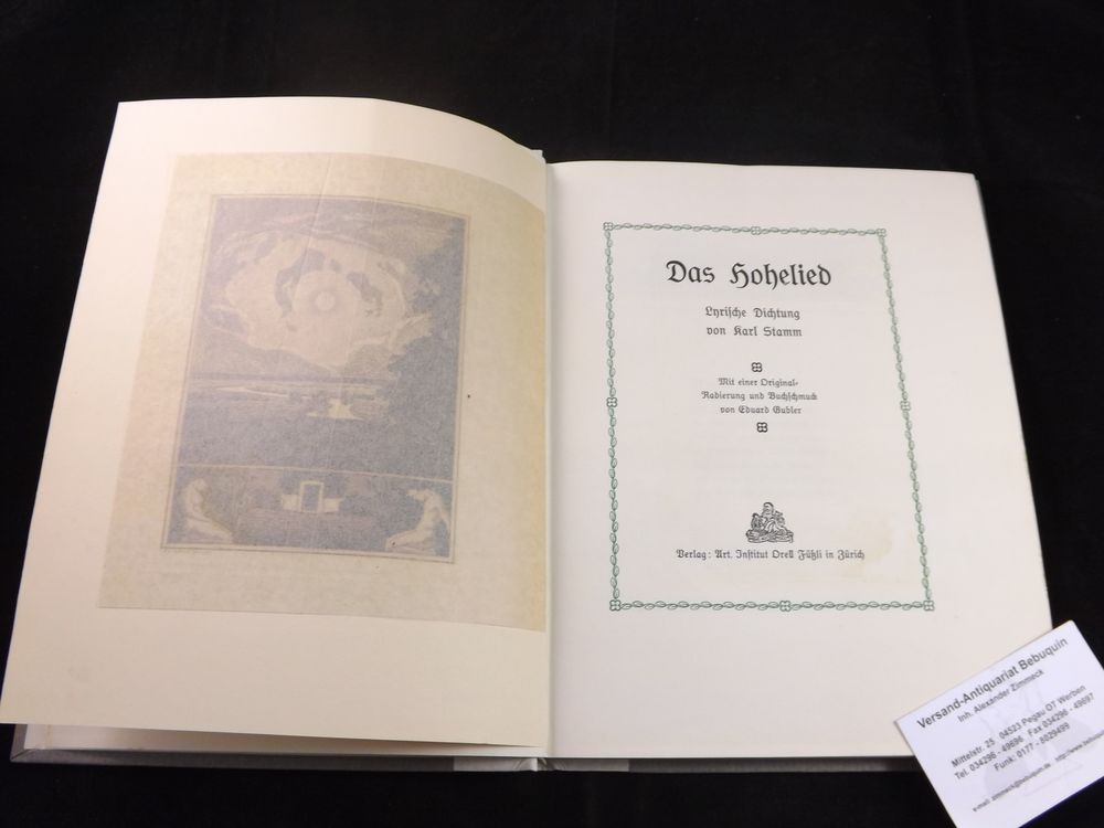 STAMM, Karl: Das Hohelied. Lyrische Dichtung. Zürich (Orell Füßli), 1913. 4°. 147 S. mit 1 Originalradierung und Buchschmuck von Eduard Gubler. OHPrgt. gutes Ex. EA des Erstlingswerks WG² 1. Karl Stamm (* 29. März 1890 in Wädenswil, Kanton Zürich; † 21. März 1919 in Zürich) war ein Schweizer Dichter. (Wikipedia)