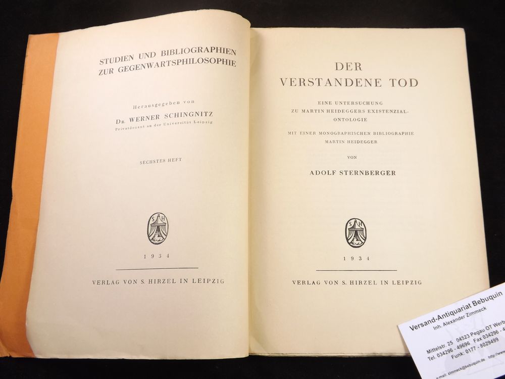 STERNBERGER, Adolf: Der verstandene Tod. Eine Untersuchung zu Martin Heideggers Existenzial-Ontologie. Mit einer monographischen Bibliographie Martin Heideggers. Leipzig (Hirzel), 1934. Gr. 8°. IX (1), 154 (2) S. OBr. Kanten leicht bestoßen und bestaubt, unaufgeschnitten. = Studien und Bibliographien zur Gegenwartsphilososphie, Heft 6. EA der ersten Veröffentlichung Ziegenfuß II/638.
