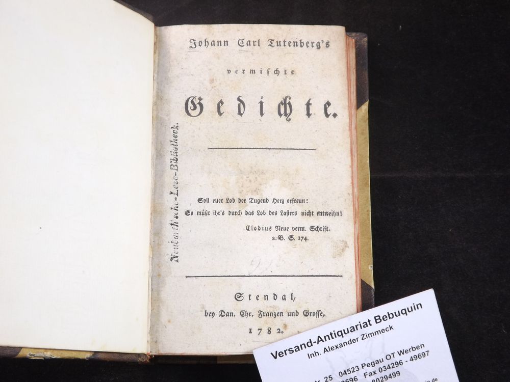 TUTENBERG, Johann Carl: Vermischte Gedichte. Stendal (Franzen und Grosse), 1782. 4 Bl., XVI, 240 S., 2 Bl. neues HLdr. unter Verwendung eines alten Rückenschildes. StaT, teils gering braunfleckig. Erste und einzige Ausgabe des Erstlingswerks. Tutenberg war Hauslehrer in Hamburg und Göttingen und wirkte zuletzt als Hauptzolleinnehmer in Bernstadt bei Zittau. Goedeke 4/1. 1092.36.1. Sehr selten.