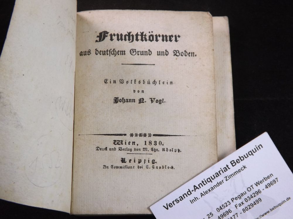 VOGL, Johann N.: Fruchtkörner aus deutschem Grund und Boden. Ein Volksbüchlein. Wien (Adolph / Cnobloch), 1830. 12°. 110 S. ill. OKart. Rücken abgerieben. EA der ersten Veröffentlichung WG² 1 mit einer eigenhändigen Karteilkarte dieses Buches von M. M. Rabenlechner.