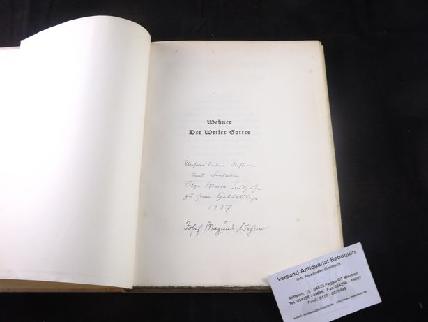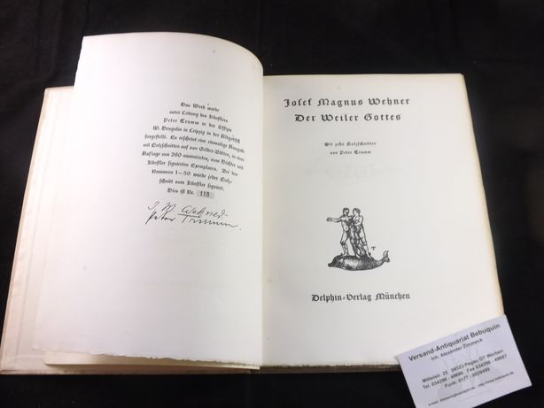 WEHNER, Josef Magnus: Der Weiler Gottes. München (Delphin), 1921. 4°. 93 (2) S. mit 10 Holzschnitten von Peter Trumm. OPb. Einband mit Lichtrand und Stockflecken, innen gut. Nr. 118 von 260 Ex. der einmaligen Ausgabe auf van Geldern Bütten, vom Dichter und Künstler signiert. Auf dem Vortitel eigenhändige, datierte und signierte Widmung von Josef Magnus Wehner an die „liebe Dichterin und Freundin Olfa Maria Budjuhn.“ Auf Seite 54 am Rand eigenhändiges, 21-zeiliges Gedicht „Für J.-Magnus“ von „Olly Budjuhn“ sowie eine kleine aquarellierte Zeichnung (Blumen-Herz) auf Seite 55.