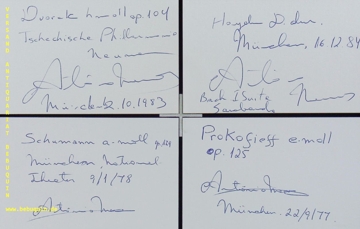 MENESES, Antoni (Cellist): 10 eigenhändig signierte und datierte Autogrammkarten mit teils ausführlichen eigenhändigen Programmbeschreibungen. München (Herkulessaal), 1977 – 2006. 8 x 12,5 cm. 10 Karteikarten. Antônio Meneses Neto (* 23. August 1957 in Recife, Pernambuco) ist ein brasilianischer Cellist. Er war Professor an der Musik-Akademie der Stadt Basel und Cellist des weltberühmten Beaux Arts Trios. (Wikipedia)