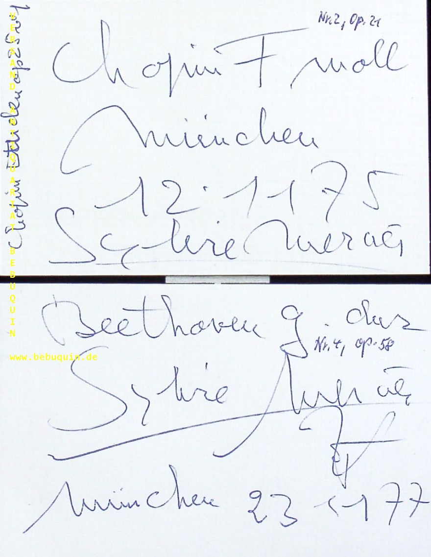 MERCIER, Sylvie (Pianistin): 2 eigenhändig signierte und datierte Autogrammkarte. München (Philharmonie), 1975 + 1977. 8 x 12,5 cm. 2 Karteikarten.