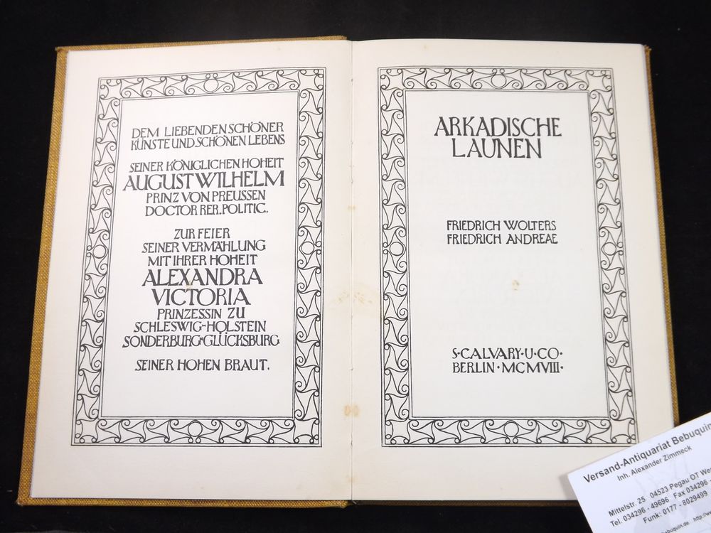 WOLTERS, Friedrich: Arkadische Launen. Mitautor: Friedrich Andreae. Berlin (Calvary), 1908. Gr. 8°. 84 S. mit Buchschmuck von Fanny Thiersch. ill. OLn. Einband leicht angeschmutzt. Nr. 67 von 530 Ex. der EA des Erstlingswerks, das zur Vermählung August Wilhelm Prinz von Preußen mit Alexandra Victoria Prinzessin zu Schleswig-Holstein als Festgabe erschien.