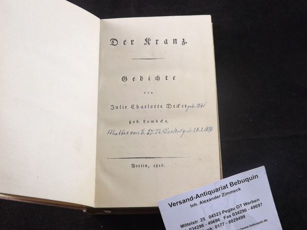 DECKER, Julie Charlotte: Der Kranz. Gedichte. Berlin (Dümmler), 1816. kl. 8°. XXVIII, 274 S. mit 1 gefalteten Notenblatt. Ln der Zeit mit goldgeprägtem Rücken. Einband bestaubt, NaT. seltene EA des einzigen Werkes der Verfasserin.