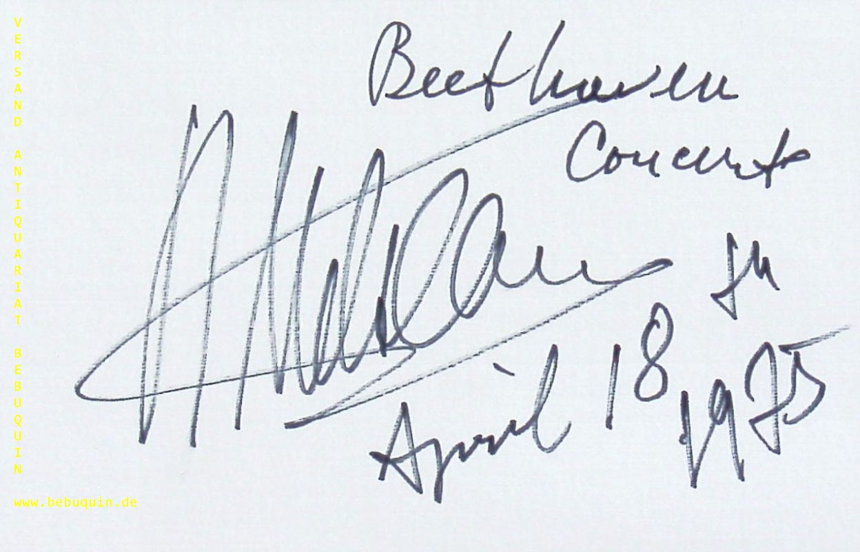 MILSTEIN, Nathan (Violinist): eigenhändig signierte und datierte Autogrammkarte: Beethoven Concert. München, 18.4.1975. 8 x 12,5 cm. Karteikarte. Nathan Milstein (* 31. Dezember 1903 † 21. Dezember 1992 in London) war ein amerikanischer Violinist ukrainischer Herkunft. Er gilt als einer der größten Geiger des 20. Jahrhunderts. (Wikipedia)