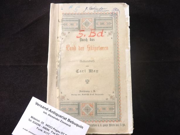 MAY, Karl: (Hier Carl May) Durch das Land der Skipetaren. Reiseerlebnisse. Freiburg (Fehsenfeld), (1892). 597 S. ill. OKart der Broschur-Ausgabe Rücken mit Leinenstreifen buchbindergerecht überklebt, Kanten teils hinterlegt, teils berieben, unbeschnitten, Name auf Umschlag, Titel und erster Seiten. = Gesammelte Reiseromane, Bd. V. Buch-Erstausgabe im original Broschur-Einband. Plaul 237.1., Jendrewski 158. Von größter Seltenheit.