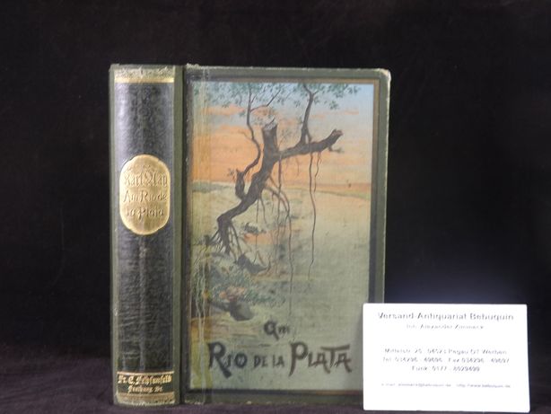MAY, Karl: Am Rio de la Plata. Reiseerzählungen. 26.– 30. Tsd. Freiburg (Fehsenfeld), (1901). 676 S. farb. ill. OLn. (DB 62). alter Rücken neu aufgezogen, Einband etwas fleckig, Rücken goldglänzend. = Gesammelte Reiseerzählungen, Bd. XII. Plaul 253.5.