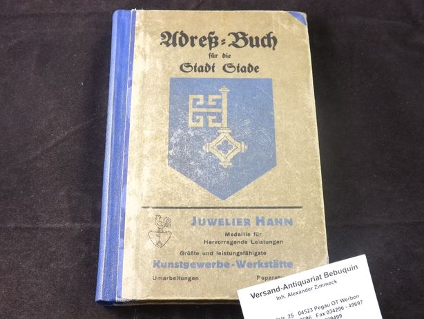 STADE.– ADRESSBUCH FÜR DIE STADT STADE (ELBE) 1932.– Hrsg. im Auftrage des Magistrats. Stade (Heimberg), 1932. Gr. 8°. 2 Bl., 216 S. ill. OHLn. Einband berieben und angeschmutzt, innen gut. sehr seltenes Adressbuch.