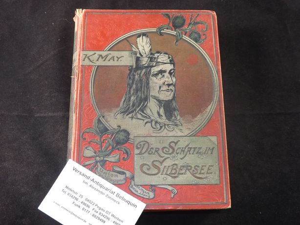 MAY, Karl: Der Schatz im Silbersee. 4. Aufl. Stuttgart (Union), (1901). 527 S. mit 16 Tondruckbildern von Ewald Thiel und den gestalteten Vorsätzen. farb. ill. OLn. DB 19. Rücken etwas gebräunt, Kanten teils angeplatzt, NaV, NaT, insgesamt noch gut erhalten. Seltene frühe Ausgabe Plaul 263.4.