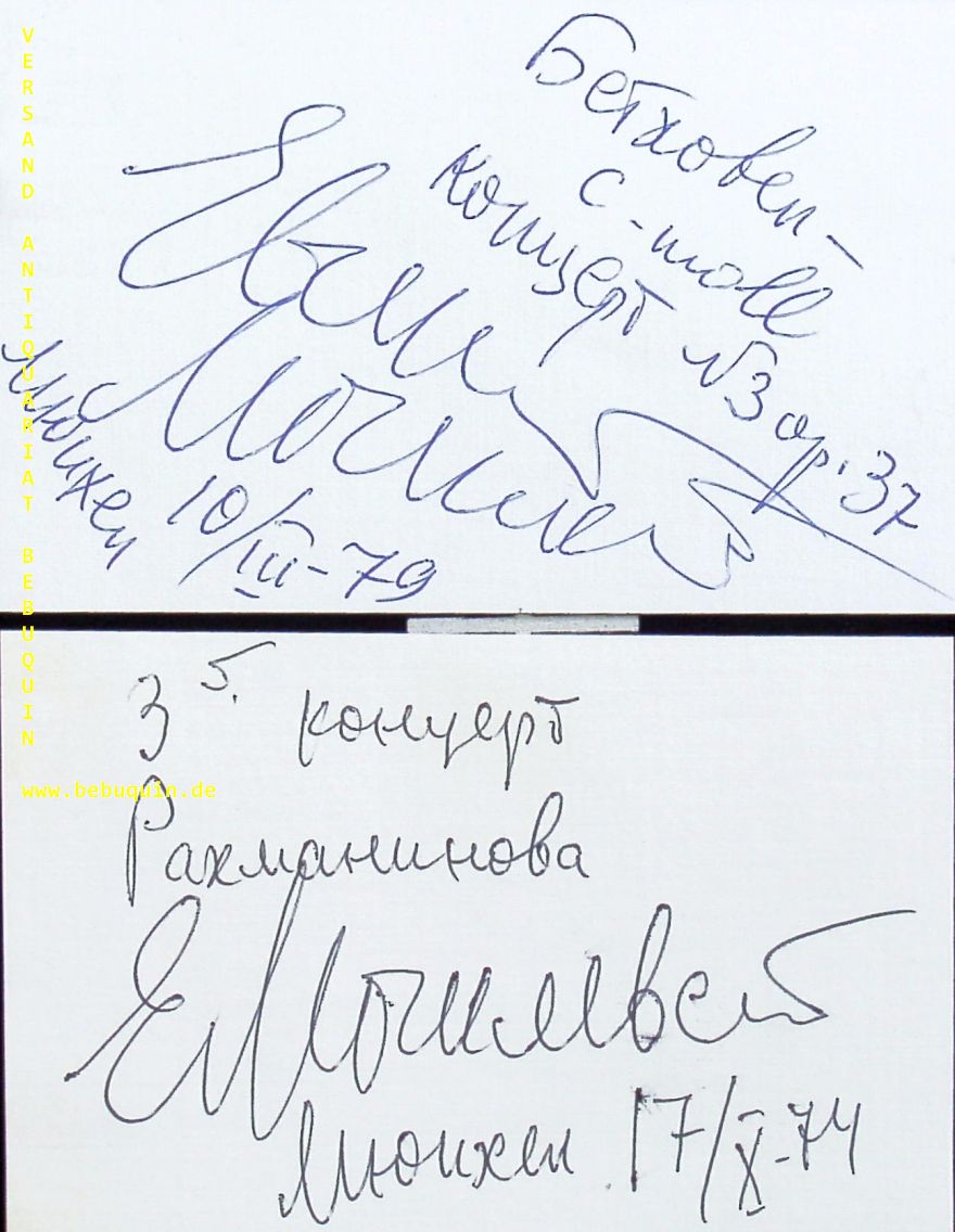 MOGILEWSKI, Jewgenij (Pianist): 2 eigenhändig signierte und datierte Autogrammkarten. München (Kongresssaal), 1974 + 1979. 8 x 12,5 cm. 2 Karteikarten. Evgeny Mogilevsky (born in 1945 in Odessa) is a Russian pianist. Son and pupil of Seraphima Mogilevsky at the Stolyarsky Music school in his hometown. Later studied with Heinrich Neuhaus and Yakov Zak at the Moscow Conservatory. Father of the pianists Maxim and Alexander Mogilevsky. (Wikipedia)