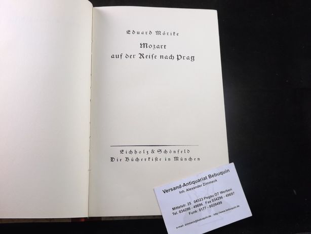MÖRIKE, Eduard: Mozart auf der Reise nach Prag. München (Eichholz & Schönfeld), 1924. Gr. 8°. 125 S. OHldr mit goldgeprägtem Rücken in OSchuber von Elisabeth Oetke-Scherpenbach. feines Ex. 1. Aufl. dieser Ausgabe.
