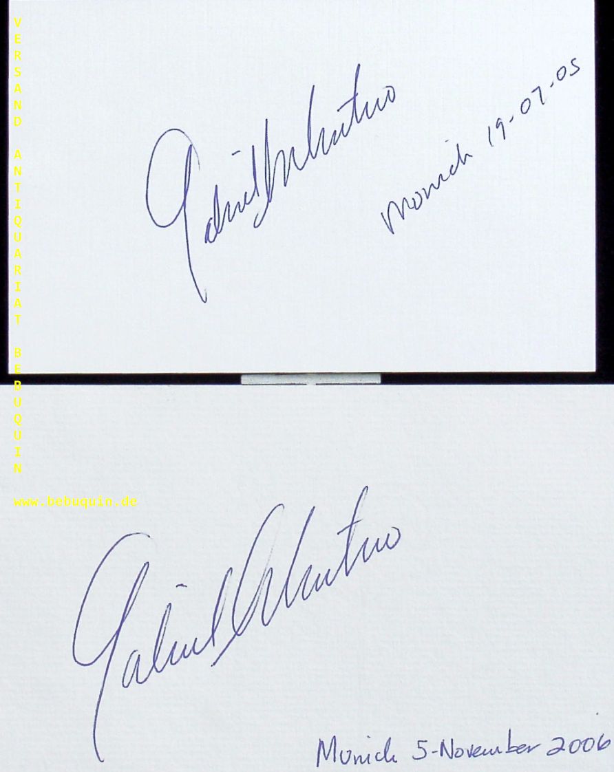 MONTERO, Gabriela (Pianistin, Komponistin): 2 eigenhändig signierte und datierte Autogrammkarten. München (Kongresssaal), 2005 + 2006. 8 x 12,5 cm. 2 Karteikarte. Gabriela Montero (* 10. Mai 1970 in Caracas, Venezuela) ist eine venezolanische Pianistin und Komponistin. (Wikipedia)