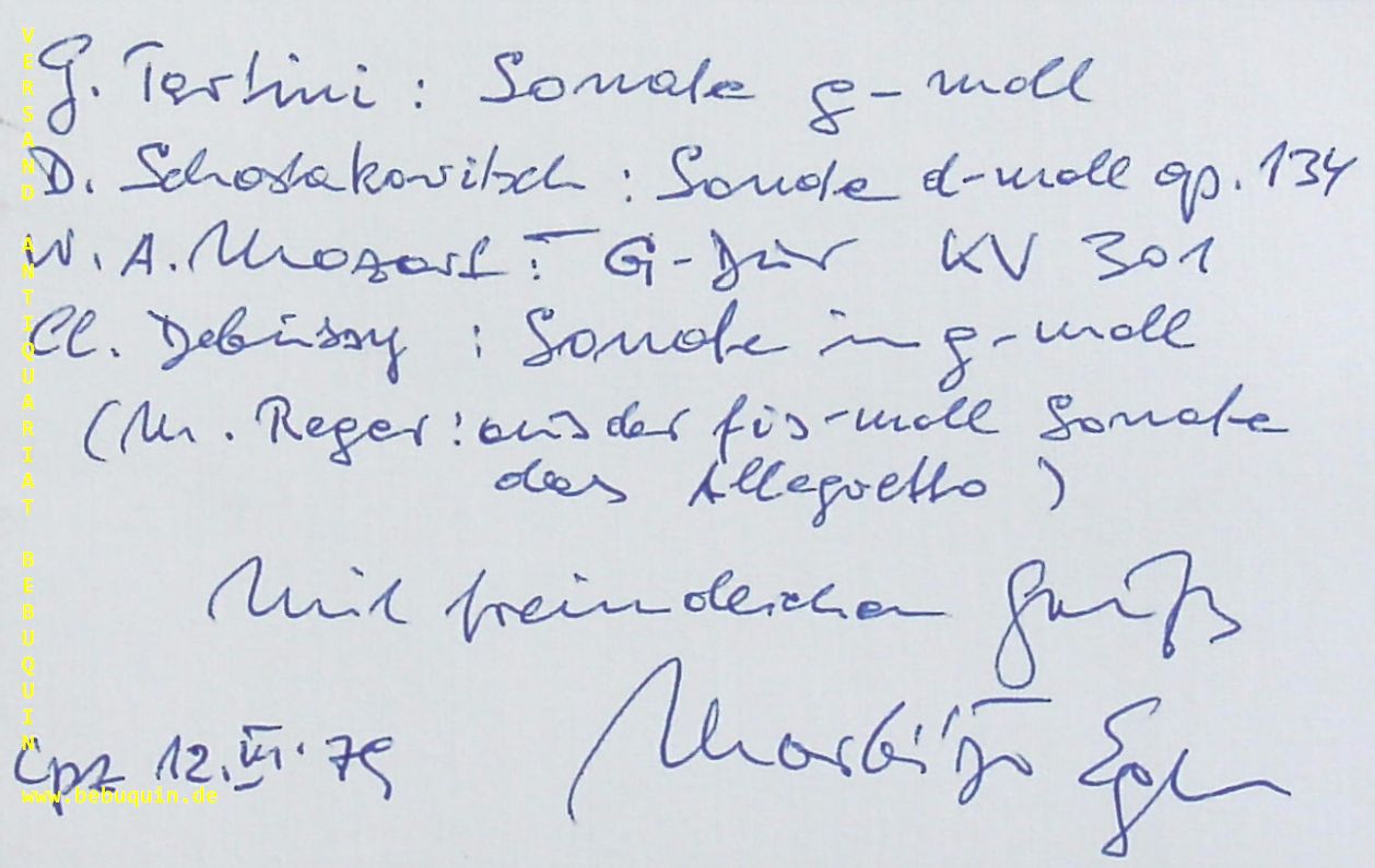 MORBITZER, Egon (Violinist): eigenhändig signierte und datierte Autogrammkarte mit ausführlicher Programmbeschreibung und freundlichem Gruß. München (Herkulessaal), 12.3.1979. 8 x 12,5 cm. Karteikarte. Egon Morbitzer (* 6. Februar 1927 in Nirklowitz bei Olmütz; † 14. März 1989 in Berlin) war ein deutscher Geiger. (Wikipedia)