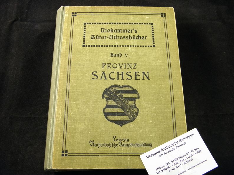 SACHSEN.– NIEKAMMER.– GÜTER – ADRESSBUCH FÜR DIE PROVINZ SACHSEN.– Bd. V. Verzeichnis sämtlicher Rittergüter, Güter und größeren Bauernhöfe mit Angabe der Guts-Eigenschaft, des Grundsteuer-Reinertrages, der Gesamtfläche … Angabe der Besitzer, Pächter und Verwalter, der Post-, Telegraphen- und Eisenbahnstationen … einem alphabetischen Orts- und Personenregister, dem Handbuch der Königlichen Behörden. Mit Unterstützung der Landwirtschaftskammer hrsg. von Ernst Seyfert. Handbuch der Königlichen Behörden. 2. Aufl. Leipzig (Reichenbach), 1913. Gr. 8°. LXVIII, 454 S. + umfangreichen Werbeanhang. ill. OHLn. Gelenke etwas gelockert, dadurch letzte Seite lose, Karte fehlt. Die seltene 2 Aufl.