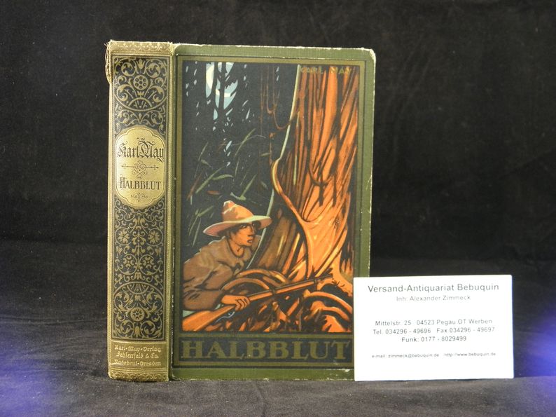 MAY, Karl: Halbblut und andere Erzählungen. Hrsg. von E.A. Schmid. Volksausgabe. 66.– 77. Tsd. Radebeul (Karl May), (1928). 603 (2) S. farb. ill. OHLn. oberes Kap angeplatzt, mit strahlendem Rückengold. = Gesammelte Werke, Bd. 38. Hermesmeier / Schmatz GW 38.8.