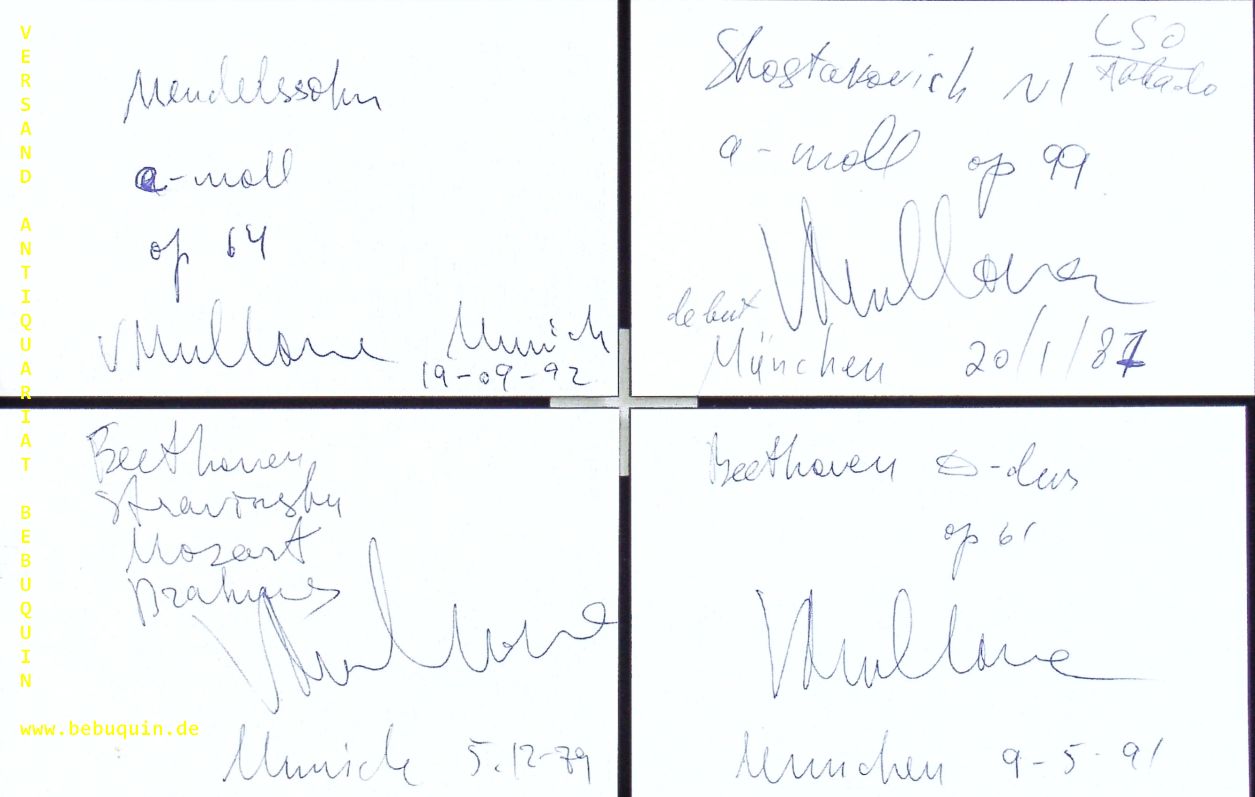 MULLOVA, Viktoria (Violinistin): 4 eigenhändig signierte und datierte Autogrammkarten. München (Herkulessaal), 1979 – 1992. 8 x 12,5 cm. 4 Karteikarten Viktoria Yurievna Mullova (* 27. November 1959 in Schukowski, Oblast Moskau) ist eine der bedeutenden Violinistinnen der Gegenwart. (Wikipedia)