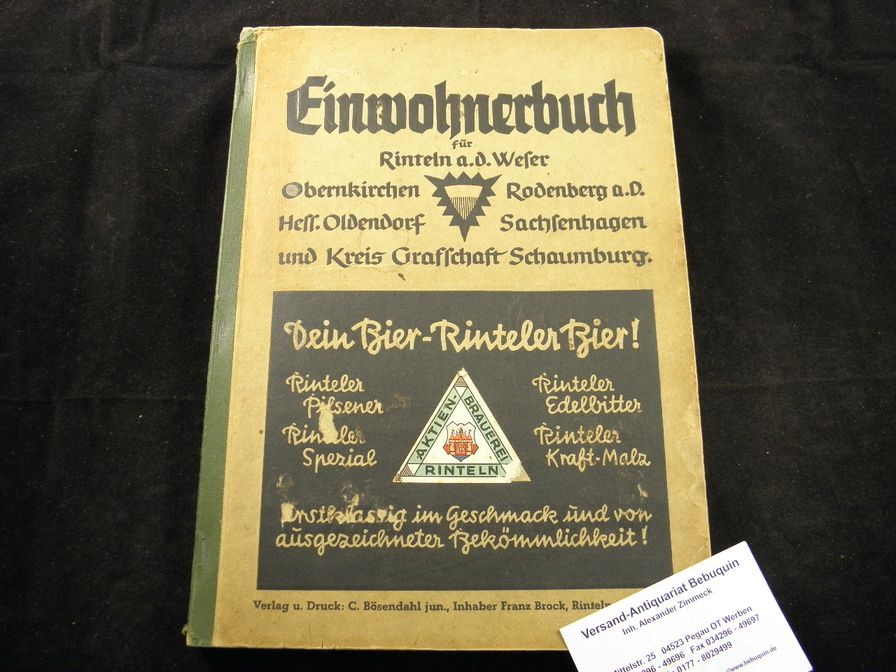 RINTELN.– EINWOHNERBUCH FÜR RINTELN AN DER WESER 1939.– Obernkirchen / Hess. Oldendorf / Rodenberg a.D. / Sachsenhagen und Kreis Graffschaft Schaumburg. Bearb. und hrgs. unter Benutzung amtlichen Materials. Rinteln (Bösendahl), 1939. 4°. VIII, 152 S., 8 Bl. Werbung mit einer neuen Übersichtskarte des Lreises Graffschaft Schaumburg. ill. OHLn. leicht gebräunt, gutes Ex. sehr seltenes Adressbuch.
