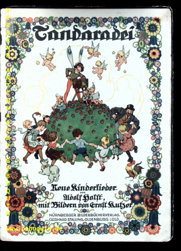 KUTZER.– HOLST, Adolf: Tandaradei. Neue Kinderlieder. 5. Aufl. Oldenburg (Stalling), (1924). Gr. 4°. 8 Bl. mit ebensovielen nahezu ganzseitigen farb. ill. von Ernst Kutzer. farb. ill. OHLn. Ec ken leicht bestoßen, Heftung kaum gelöst, insgesamt gutes Ex. des anspruchsvollen und empfindlichen Titels. Blaume 070, Klotz 2869/165.