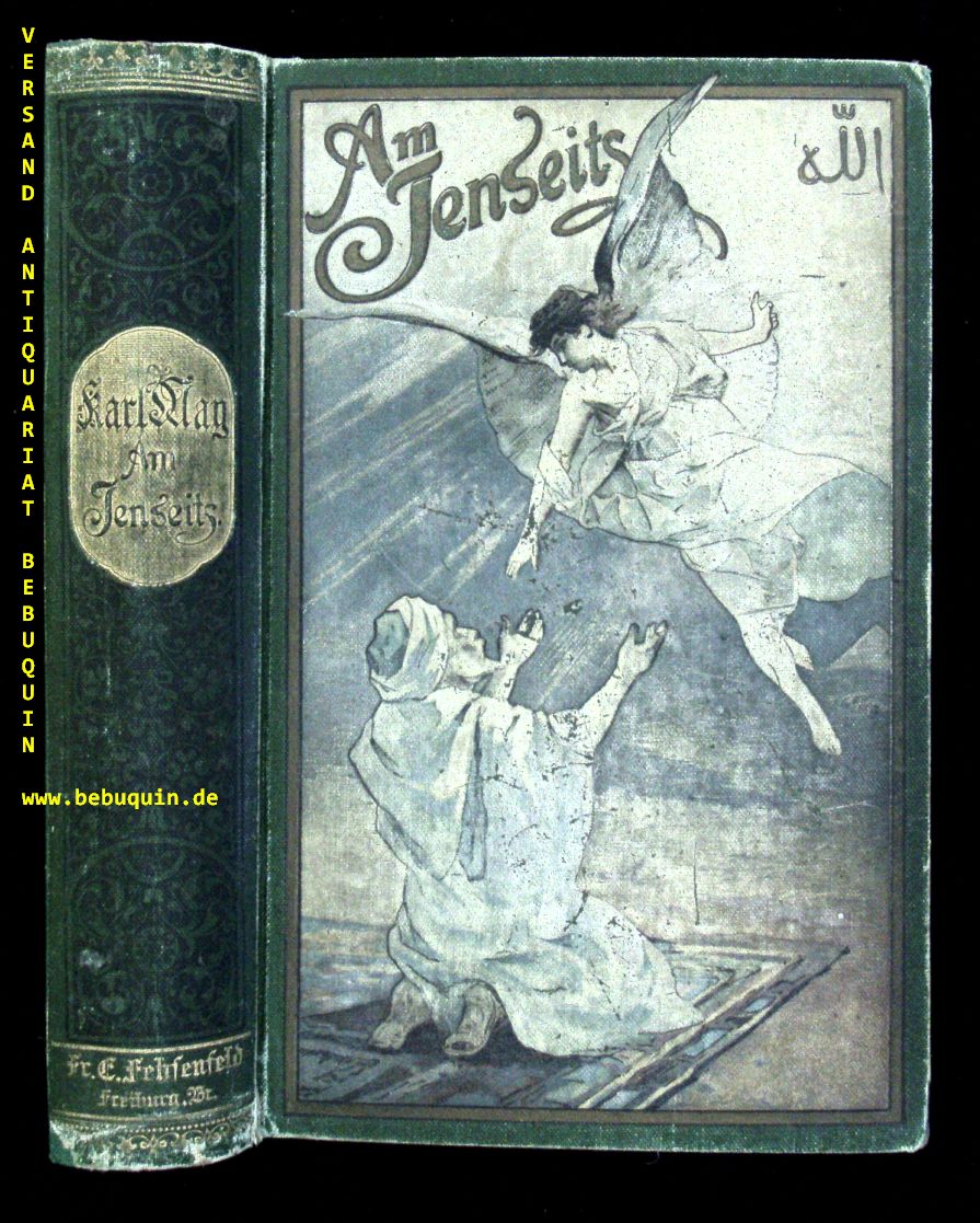 MAY, Karl: Am Jenseits. Reiseerlebnisse 1.– 15. Tsd. Freiburg (Fehsenfeld), (1899). 594 (1) S. farb. ill. OHLn. Einband etwas berieben, Gelenke stabilisiert, einige Stockflecken, noch ordentlich. = Gesammelte Werke, Bd. XXV. EA Plaul 311.1.