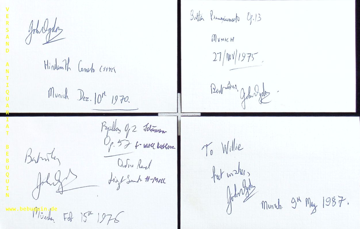 OGDAN, John (Pianist): 4 eigenhändig signierte und datierte Autogrammkarten. Die letzte mit der eigenhändigen Widmung: To Willie best wishes. München (Herkulessaal), 1970 – 1987. 8 x 12,5 cm. 4 Karteikarten. John Andrew Howard Ogdon (* 27. Januar 1937 in Mansfield Woodhouse, Nottinghamshire; † 1. August 1989 in London) war ein englischer Pianist und Komponist. (Wikipedia)