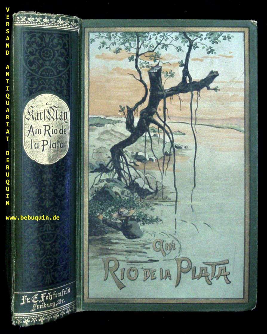 MAY, Karl: Am Rio de la Plata. Reiseerzählungen. 41.– 45. Tsd. Freiburg (Fehsenfeld), (1911). 676 S. farb. ill. OLn. (DB 62). etwas schief gelesen, schönes farbstarkes Ex. mit goldenem Rücken. = Gesammelte Reiseerzählungen, Bd. XII. Letzte Auflage bei Fehsenfeld. Plaul 253.8.