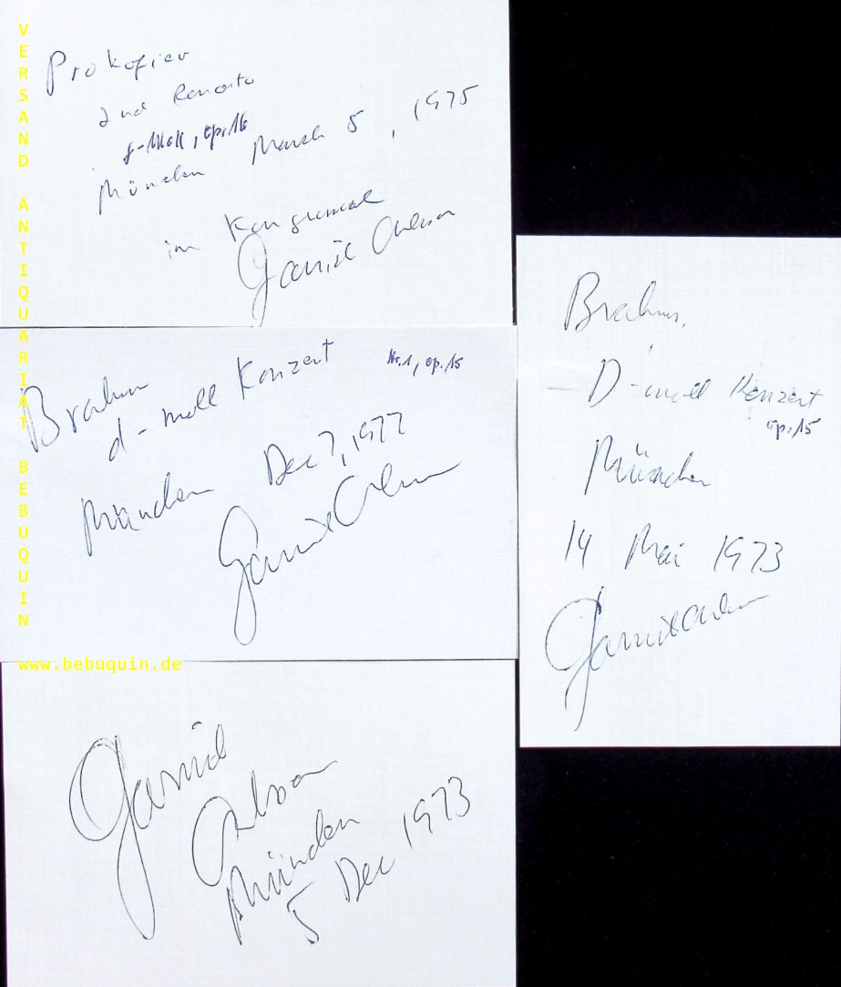 OHLSSON, Garick (Pianist): 4 eigenhändig signierte und datierte Autogrammkarten. Die letzte mit der eigenhändigen Widmung: To Willie best wishes. München (Herkulessaal), 1972 – 1975. 8 x 12,5 cm. 4 Karteikarten. Garrick Ohlsson (* 3. April 1948 in Bronxville (New York)) ist ein US-amerikanischer Pianist. Ohlsson ist der bisher einzige US-Amerikaner, der den Internationalen Chopin-Wettbewerb in Warschau gewonnen hat. (Wikipedia)