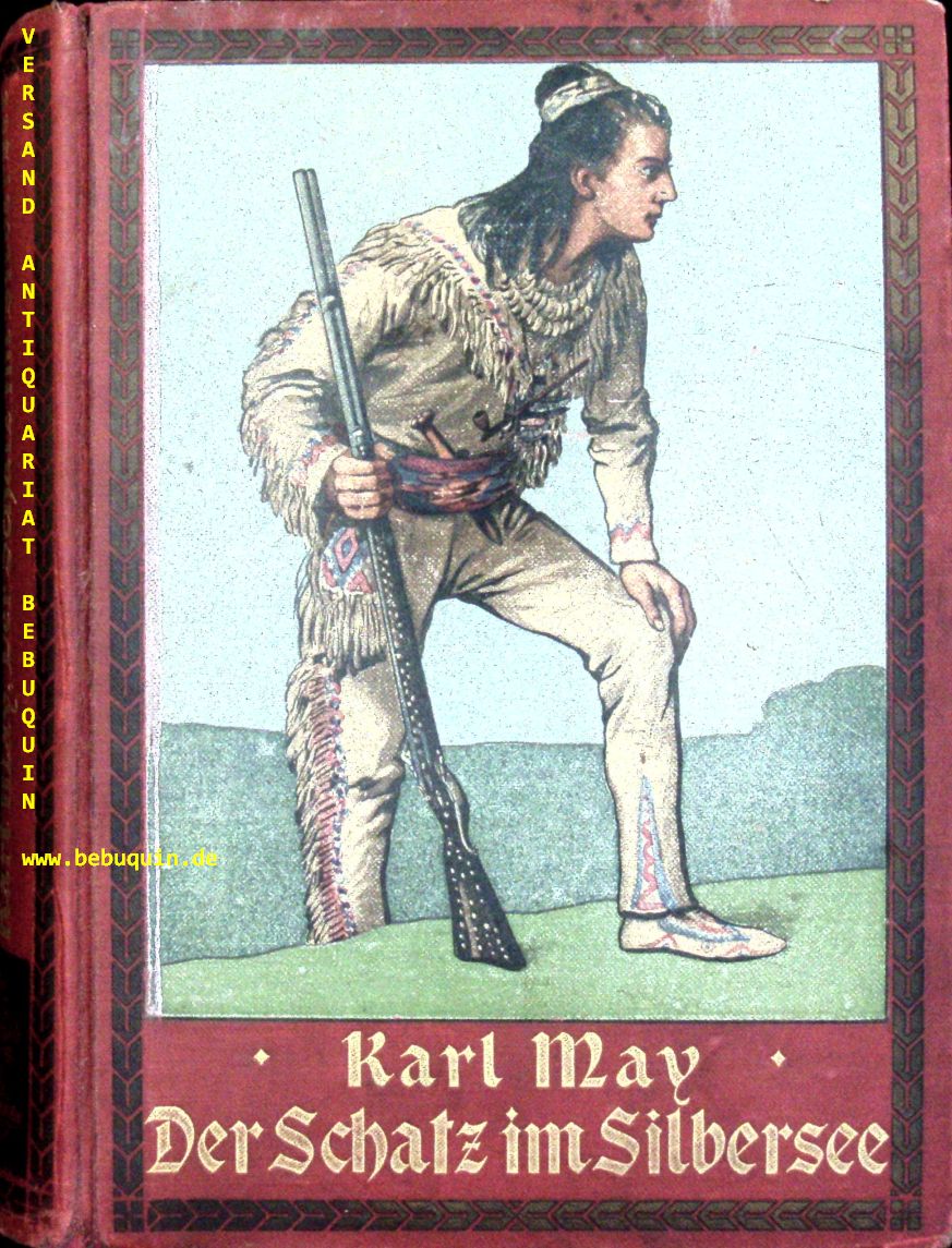 MAY, Karl: Der Schatz im Silbersee. 6. Aufl. Stuttgart (Union), (1907). 527 (5)S. mit 16 Tondruckbildern von Ewald Thiel. farb. ill. OHLn. mit neu aufgezogenem Rücken. DB 20. Vorsätze erneuert, feines festes Ex. Seltene frühe Ausgabe Plaul 263.6.