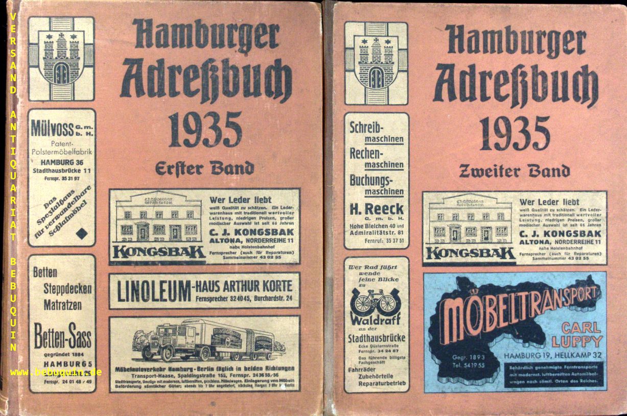 HAMBURG.– HAMBURGER ADRESSBUCH 1935.– Hamburger Staats- und Stadtadressbuch. Adressbuch für Hamburg, Altona, Wandsbek und Umgegend. Hamburger Einwohnerbuch. Hamburger Bürgerbuch mit ausführlichem Branchenbuch. 2 Bände. Hamburg (Adreßbuch), 1935. 4°. ca 4000 S. ill. OLn. fein restaurierte Einbände, innen sehr stabil und nur mit wenigen Einrissen. Insgesamt schwergewichtig und gut erhalten. Sehr seltenes Adressbuch.