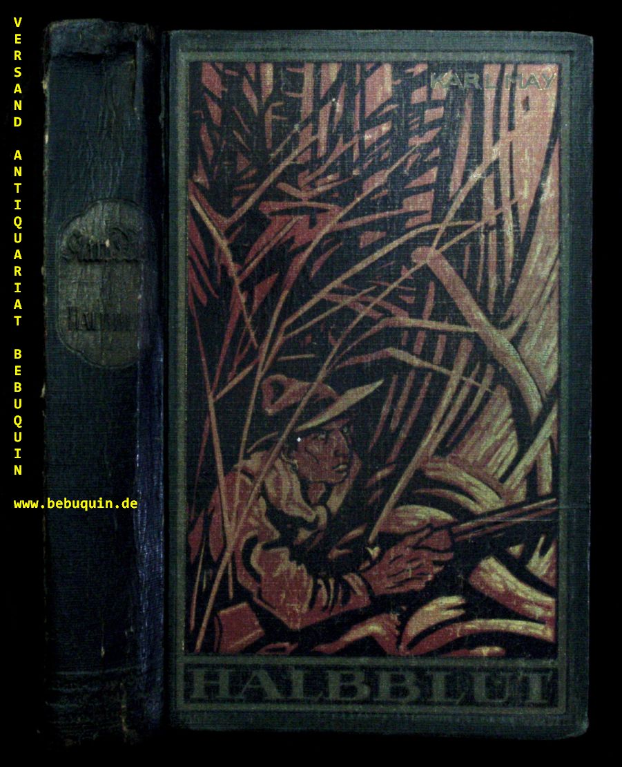 MAY, Karl: Halbblut und andere Erzählungen. Hrsg. von E.A. Schmid. 31.– 41. Tsd. Radebeul (Karl May), (1920). 603 (2) S. farb. ill. OPb. Rücken stark gebräunt, Schnitt etwas fleckig. = Gesammelte Werke, Bd. 38. seltene frühe Auflage. Hermesmeier / Schmatz GW 38.5. Verlagswerbung in der Seitenzahl von Hermesmeier abweichend.
