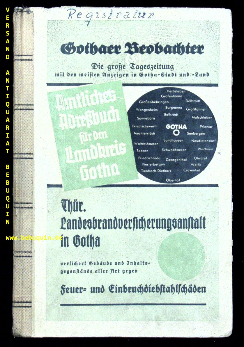 GOTHA.– AMTLICHES ADRESSBUCH DES LANDKREISES GOTHA 1936.– Bearb. auf Grund amtlichen Materials. Gotha (Reyher), 1936. 596 S. mit diversen kleinen Kirchen- und Dorfansichten. ill. OHLn. etwas angeschmutzt und gelockert, insgesamt gut erhalten.