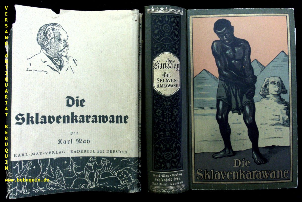 MAY, Karl: Die Slavenkarawane. Erzählung aus dem Sudan. 121.– 140. Tsd. Radebeul (Karl May), (1936). 632 (3) S. farb. ill. OLn. mit OUmschl. (SU6). Umschlag am Rücken stärker lädiert, NaV, Ex libris verso Reihentitel, farbstarker Einband mit goldglänzendem Rücken. = Gesammelte Werke, Bd. 41. Hermesmeier / Schmalz GW 41.13.
