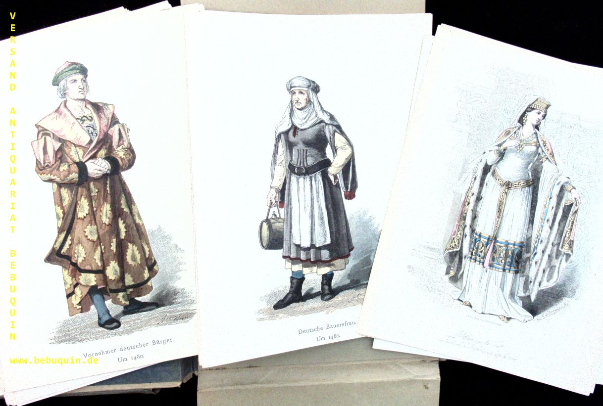 MODE.– LIPPERHEIDE, Fanz von.– 151 Historische Kostüm- und Volkstrachten-Bilder. Aus der Sammlung Franz von Lipperheide. 2 Mappen. Berlin (Weise), ca 1900 Gr. 8°. 102 (anstelle 100) + 49 (von 50) kolorierte Holzstichtafeln lose in zwei OPbMappen. überwiegend feine farbstarke Drucke in stärker lädierten Mappe, die Blätter der kleineren Mappen rückseitig mit Namensstempel. EA dieser umfangreichen internationalen Ansichtensammlung. Franz von Lipperheide war gelernter Buchhändler. In Berlin arbeitete er zunächst in einem Modeverlag, der die Modezeitschrift Bazar herausbrachte. Dort lernte er auch seine erste Frau Frieda Gestefeld kennen. Im Jahr 1865 gründete er den Verlag Franz Lipperheide in Berlin und begann mit der Herausgabe des Modemagazins Modenwelt dessen Leitung später seine Frau übernahm. Die Zeitschrift hatte großen Erfolg, es folgten sogar Ausgaben im Ausland. Um einen Unterhaltungsteil erweitert erschien die Zeitschrift ab 1874 als Illustrierte Frauenzeitung.