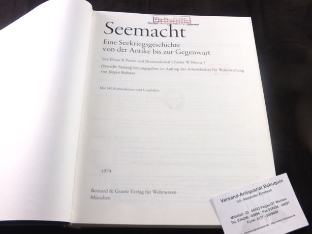 SCHIFFAHRT.– POTTER, Elmar B. + NIMITZ, Chester W.: Seemacht. Eine Seekriegsgeschichte von der Antike bis zur Gegenwart. Deutsche Fassung von Jürgen Rohwer. München (Bernard & Graefe), 1974. 4°. XVIII, 1201 S. mit 342 Kartenskizzen und Graphiken. OLn. Ordnungsgemäß aus Bundeswehrbeständen ausgesondertes Bibliotheksexemplar (Stempel, Rückenschild). dt. EA.