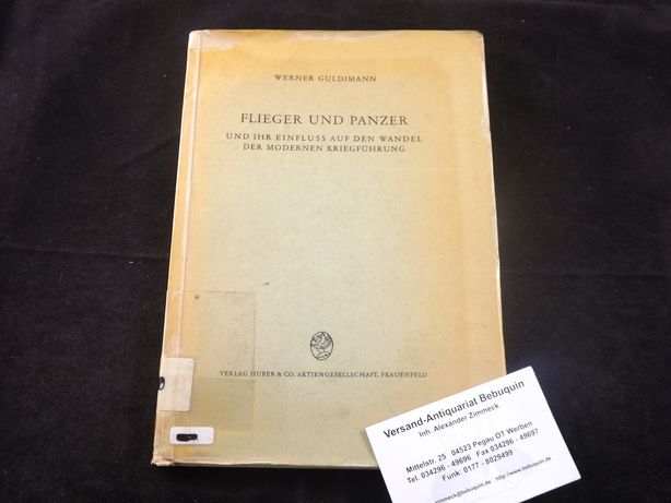 LUFTFAHRT.– GULDIMANN, Werner: Flieger und Panzer. Und ihr Einfluss auf den Wandel der modernen Kriegführung. Frauenfeld (Huber), (1946). Gr. 8° 110 (1) S. mit Abb. fol. OKart. Ordnungsgemäß aus Bundeswehrbeständen ausgesondertes Bibliotheksexemplar (Rückenschild, Stempel), Einband mit Lichtrand. EA.